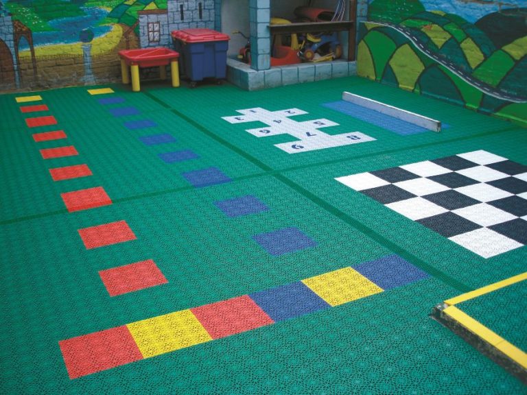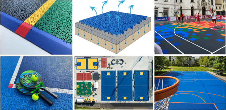 Самият монтаж на подовете не може да бъде по-прост, което е още едно голямо предимство. Уникалната конструкция позволява добра издръжливост, отскок и триене. Перфорираната плоча и дизайнът отдолу имат отлични дренажни способности, които ще позволят на терена да изсъхне бързо след дъжд, като по този начин предотвратява образуването на локви. Настилката може да се поставя навън през лятото и зимата и при всякакви климатични условия.