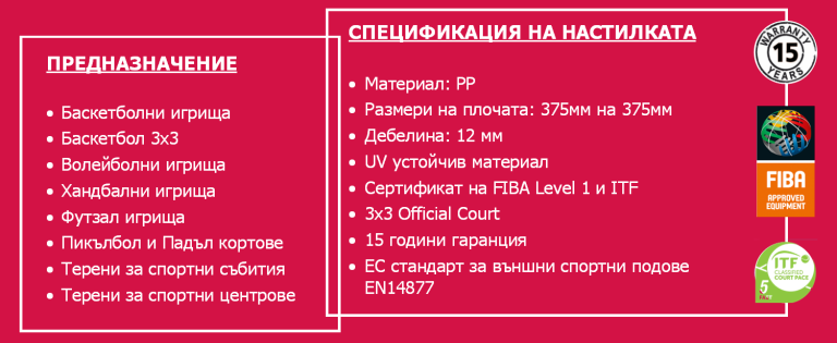 Направете бърза промяна със спортните настилки Bergo! Без инструменти, химикали, винтове или лепило, подът се полага бързо. За фиксиран или преносим монтаж.